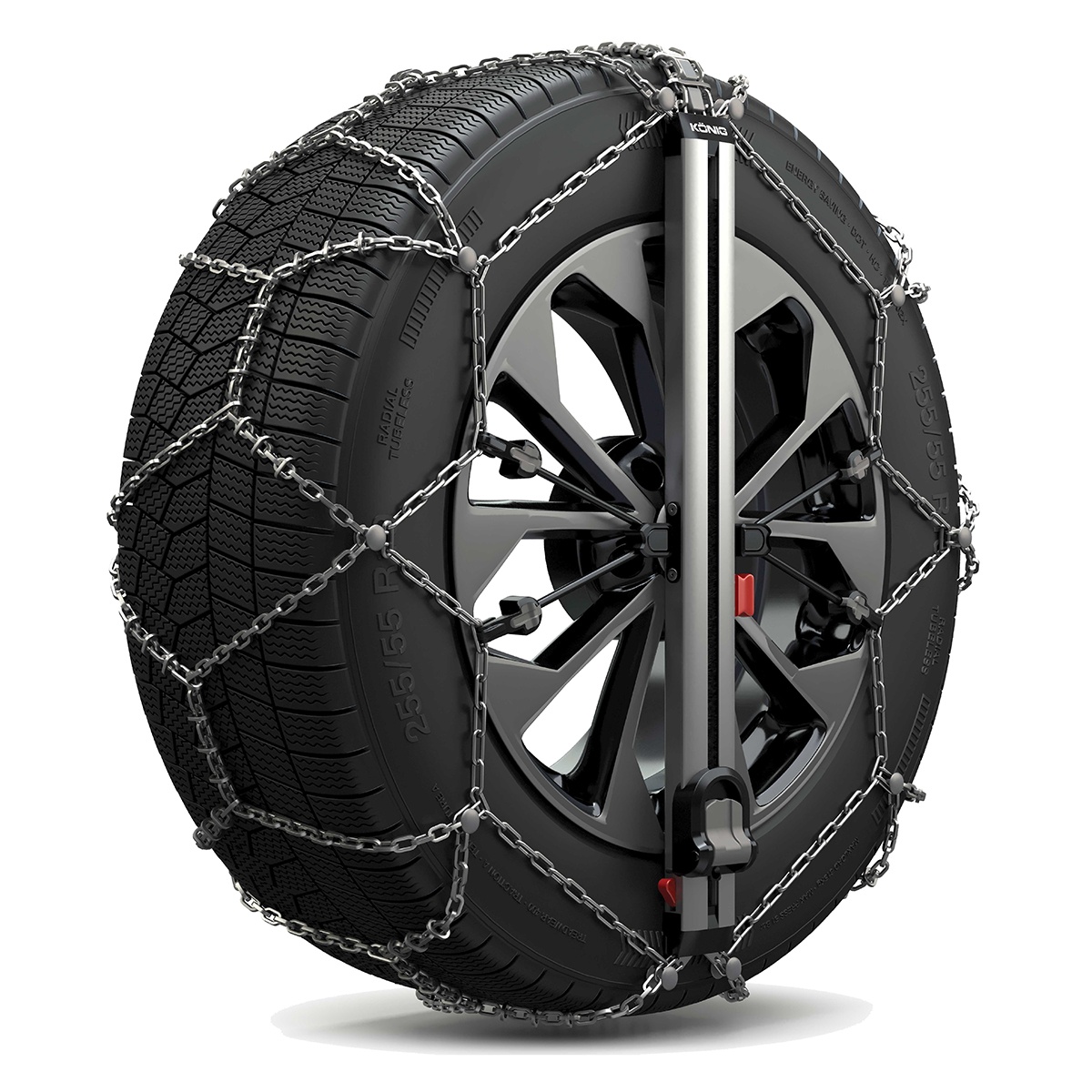 - Bara verticala din aluminiu care este situata in centrul sistemului de tensionare, special realizata pentru SUV-uri, este dotata cu o clapeta care se deschide si care printr-o simpla apasare cu piciorul activeaza auto tensionarea lantului, astfel in momentul in care autoturismul este pus in miscare lantul antiderapant König Easy-Fit SUV se aranjeaza singur pe roata.