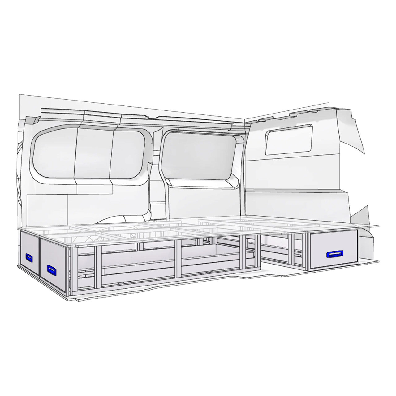 Sertarele de sub podea din acest Kit  sunt concepute pentru majoritatea vehiculelor comerciale de dimensiuni medii, cum ar fi Mercedes Vito, VW Transporter sau Ford Custom, Toyota ProAce, sunt foarte utile pentru electricieni, instalatori, instalatori HVAC si orice alta profesie care necesita transportul sculelor si elementelor de asamblare intr-un mod sigur.