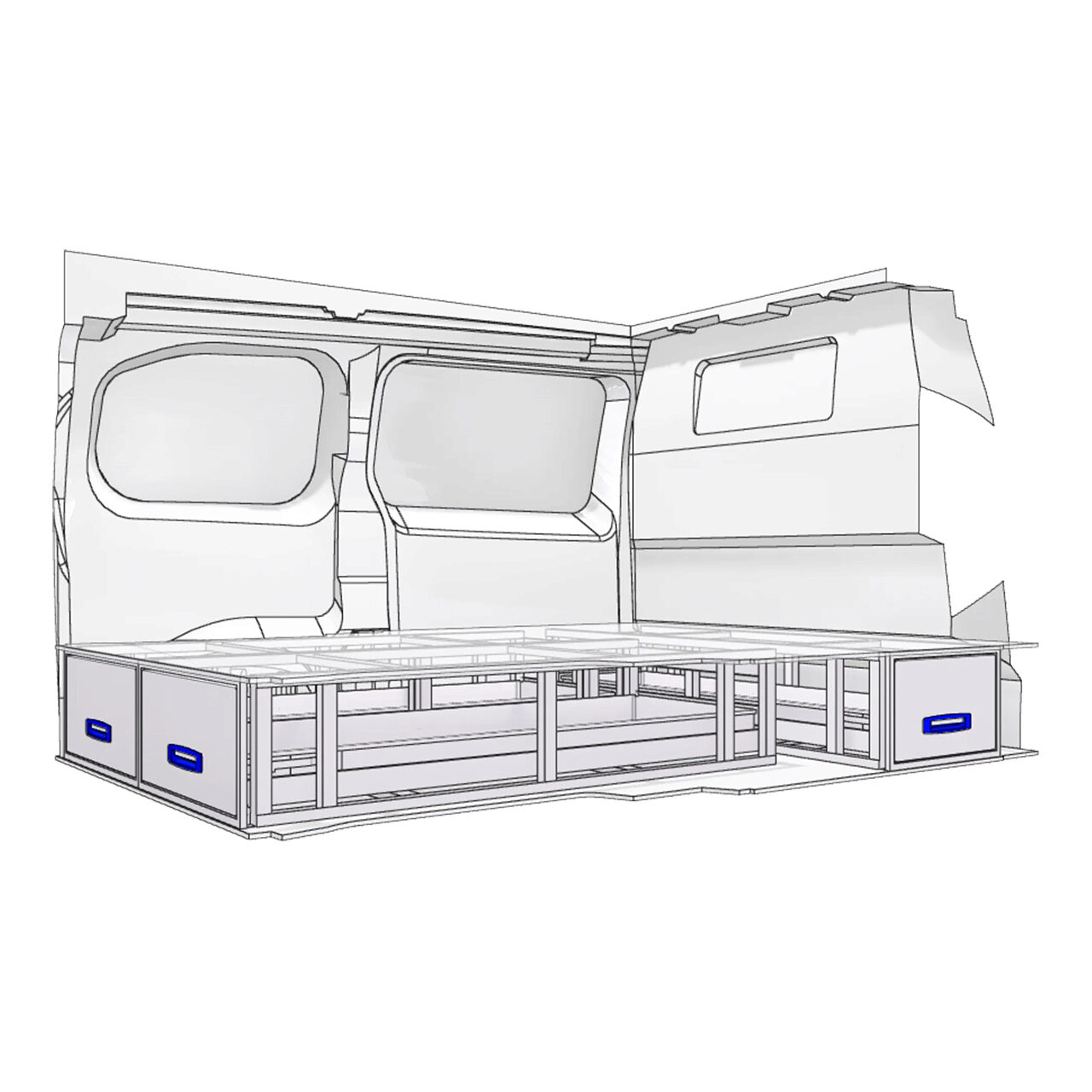 Sertarele de sub podea din acest Kit  sunt concepute pentru majoritatea vehiculelor comerciale de dimensiuni medii, cum ar fi Mercedes Vito, VW Transporter sau Ford Custom, Toyota ProAce, sunt foarte utile pentru electricieni, instalatori, instalatori HVAC si orice alta profesie care necesita transportul sculelor si elementelor de asamblare intr-un mod sigur.