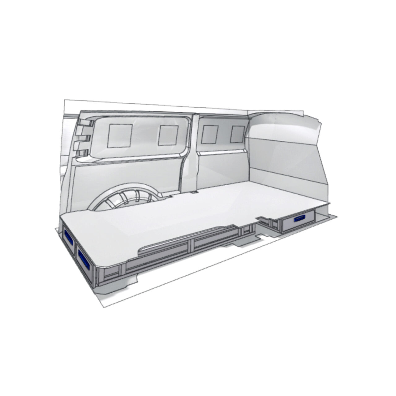 Sertarele de sub podea din acest Kit  sunt concepute pentru majoritatea vehiculelor comerciale de dimensiuni medii, cum ar fi Mercedes Vito, VW Transporter sau Ford Custom, Toyota ProAce, sunt foarte utile pentru electricieni, instalatori, instalatori HVAC si orice alta profesie care necesita transportul sculelor si elementelor de asamblare intr-un mod sigur.