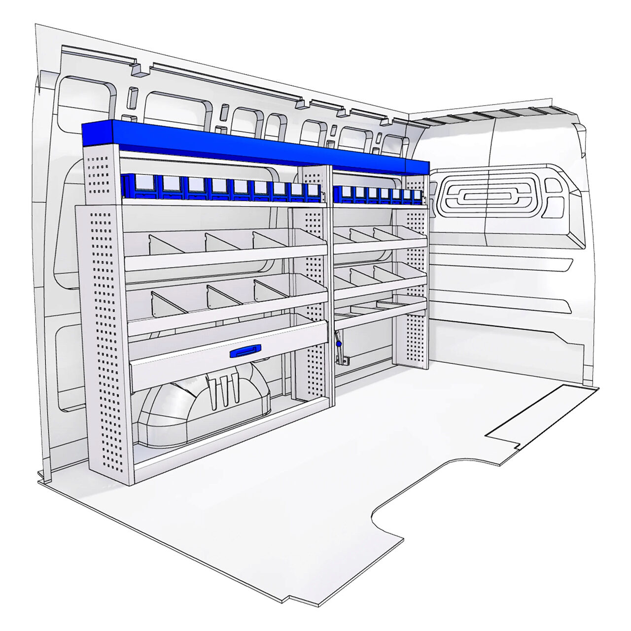 Corpuri tip atelier pentru vehicule comerciale mari, cum ar fi Mercedes Sprinter, VW Crafter, Fiat Ducato sau Ford Transit, care va permit sa le transformati in ateliere de dimensiuni mari si echipate.