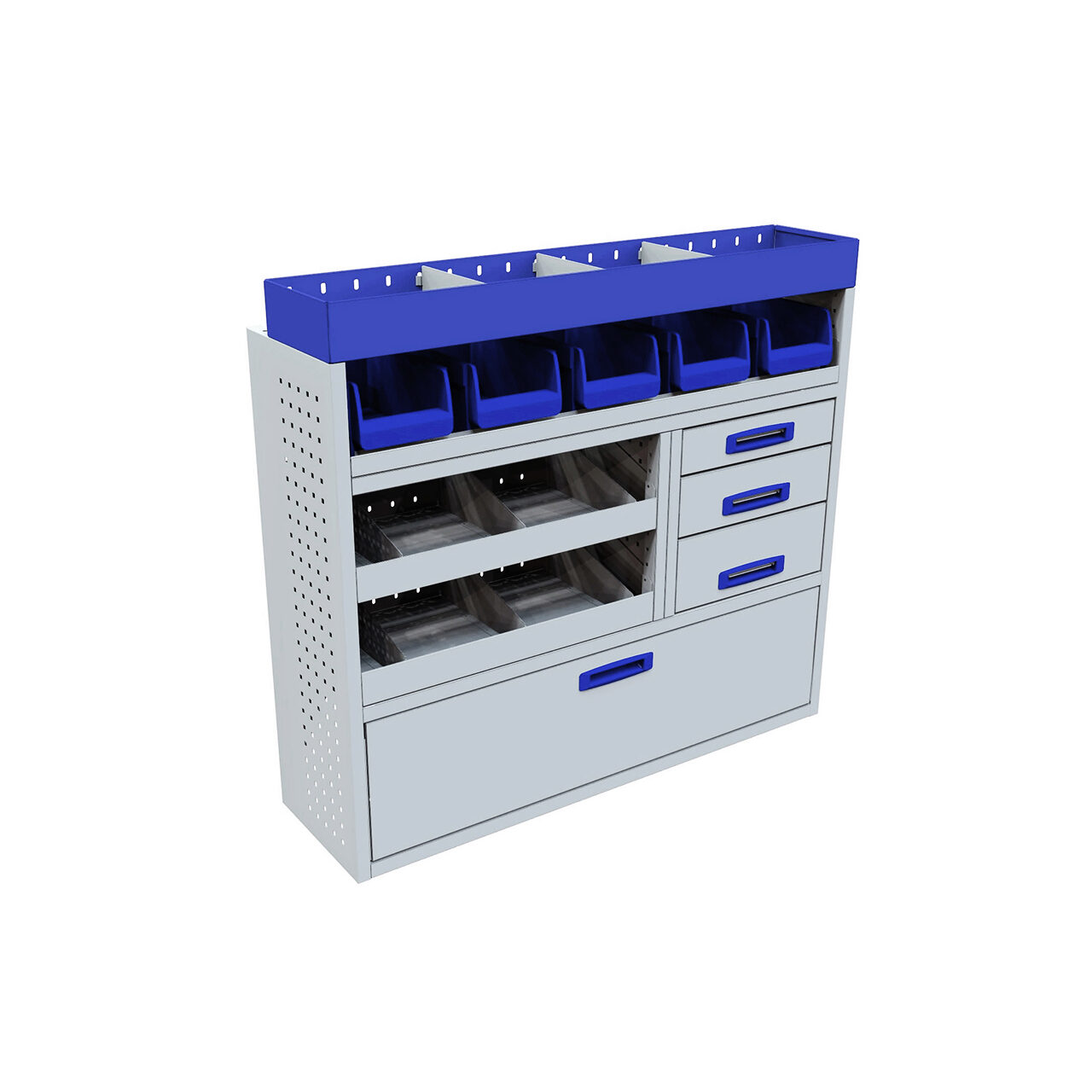 Modul cu clapa frontala, 3 sertare , 2 rafturi 0,75m, suport pentru cutii si raft superior