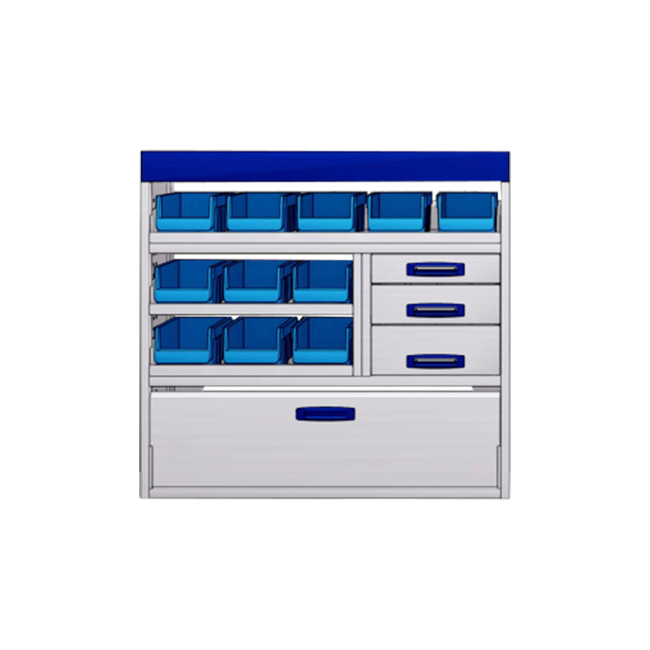 Modul cu clapa frontala, 3 sertare, 3 rafturi interioare, suport pentru cutii si raft superior